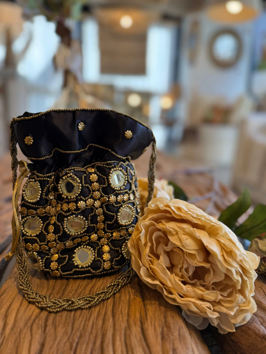 Descubrí la magia artesanal de la India con este bolsito importado, ideal para quienes buscan un accesorio único y sofisticado. Posee base rígida de 12 cm de diámetro y 19 cm de alto, cierre ajustable y detalles bordados con mostacillas, espejos e hilo dorado. Su tira para colgar, trenzada en mostacillas bronce, suma distinción y originalidad a tu look.
