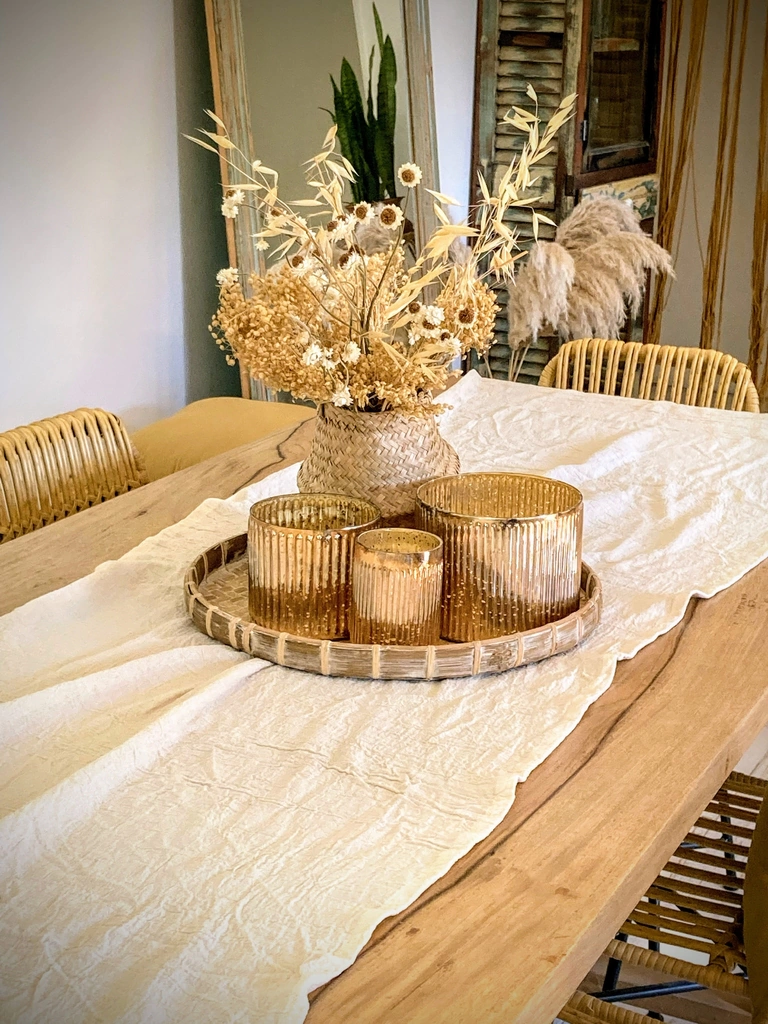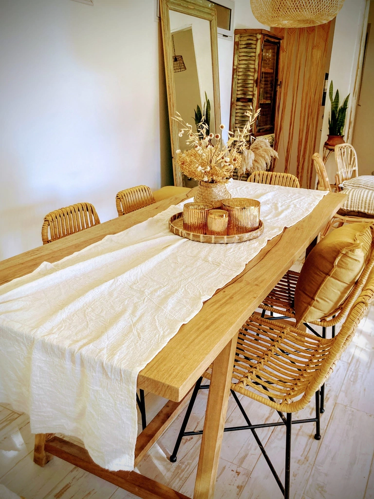 Este camino de mesa no solo es funcional, sino que también aporta un toque de calidez y distinción a tu hogar. Perfecto para cenas elegantes, celebraciones o simplemente para realzar tu día a día.