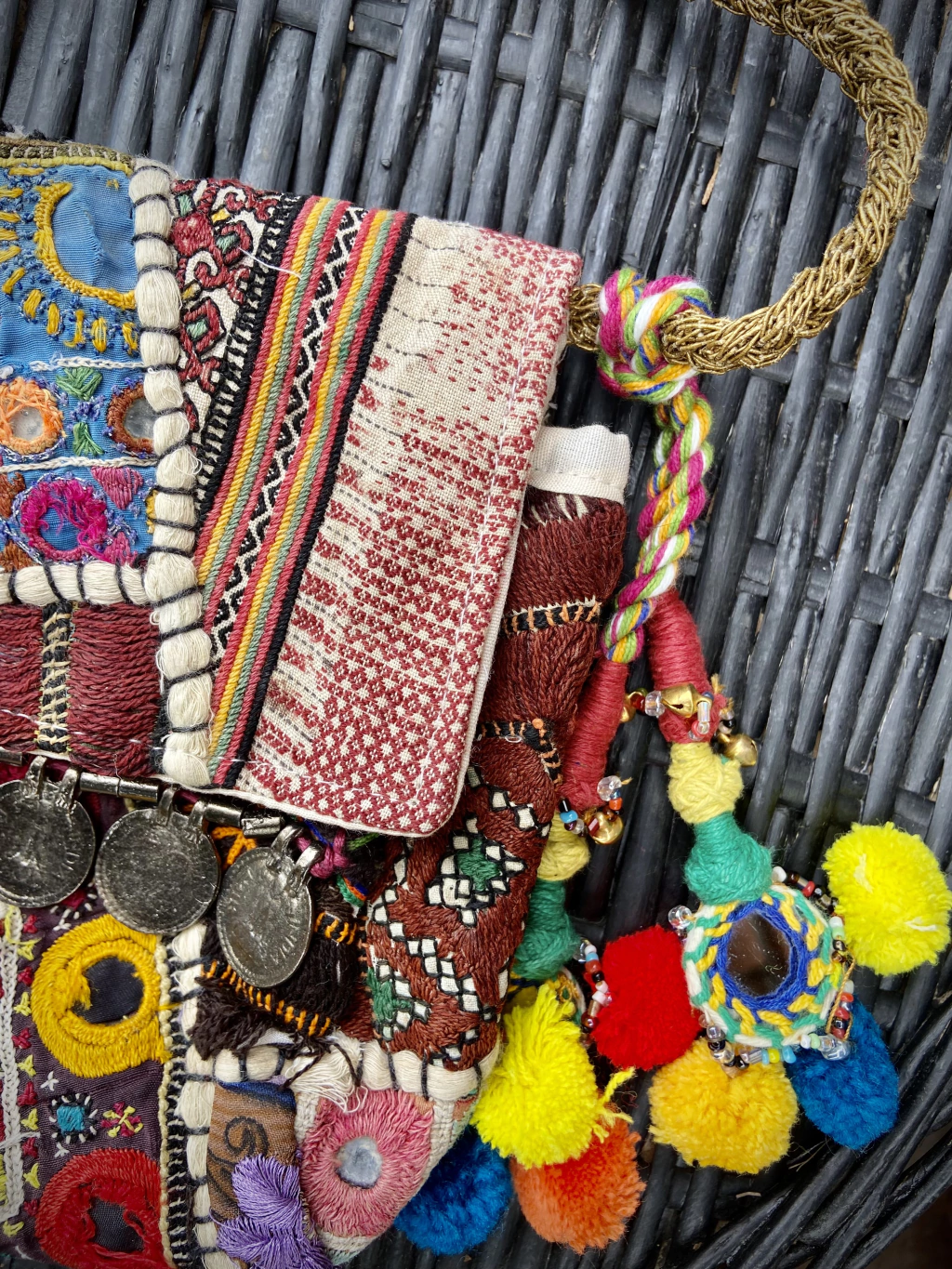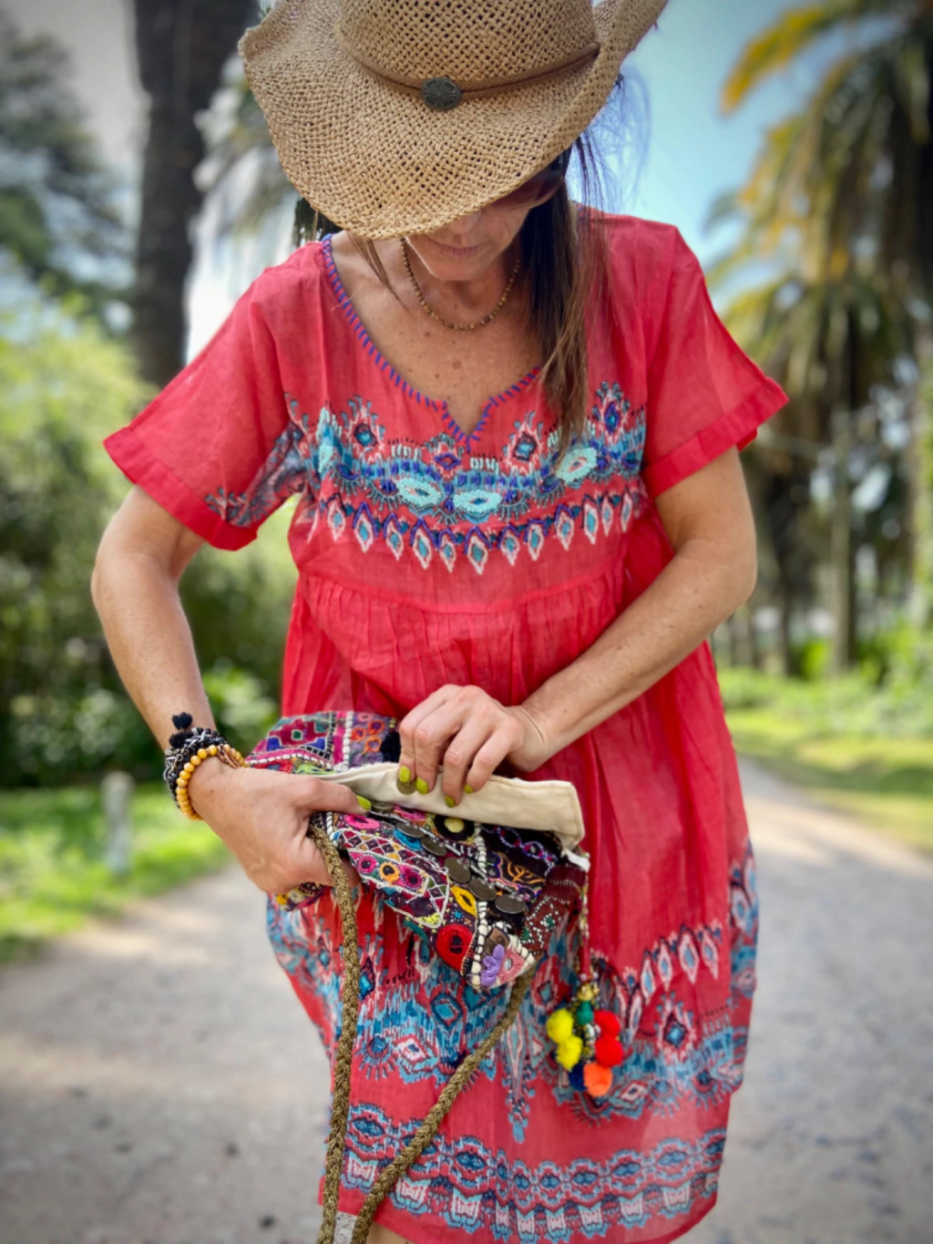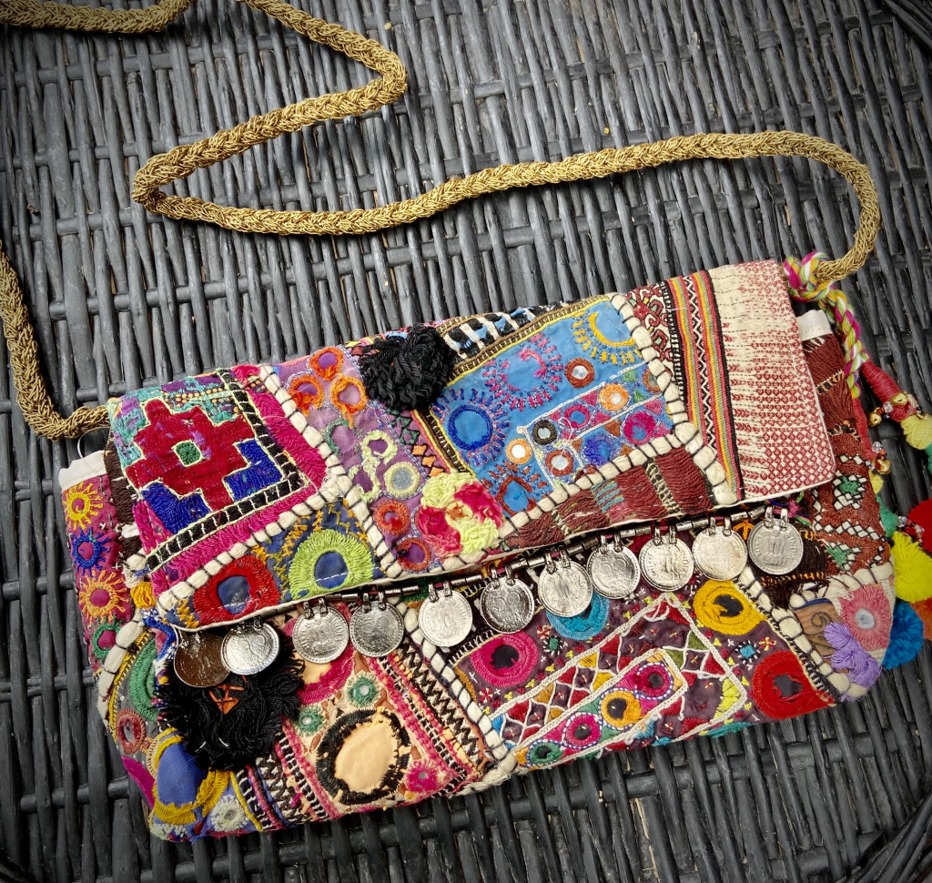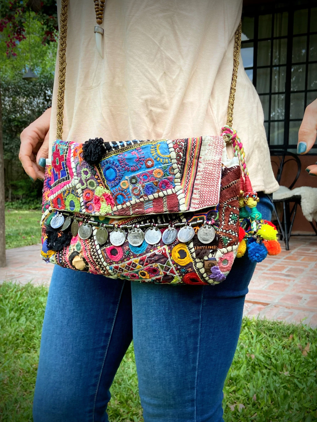Cartera o sobre bordado, con solapa con cierre imantado y tira de pompones al costado. Detalle de monedas metálicas. Son piezas únicas, varían los tonos y bordados