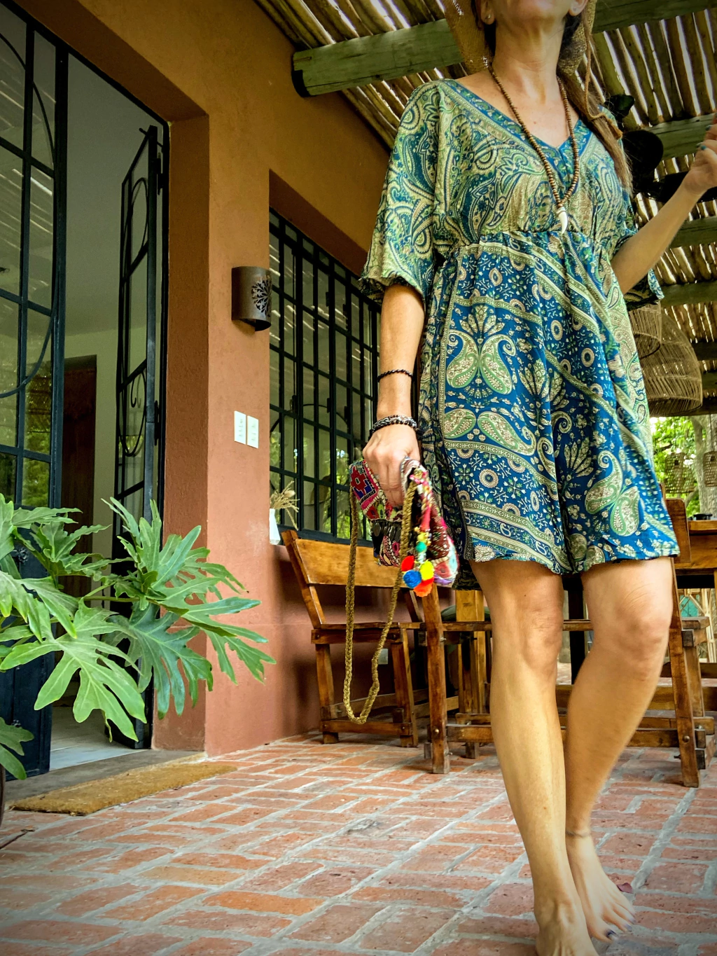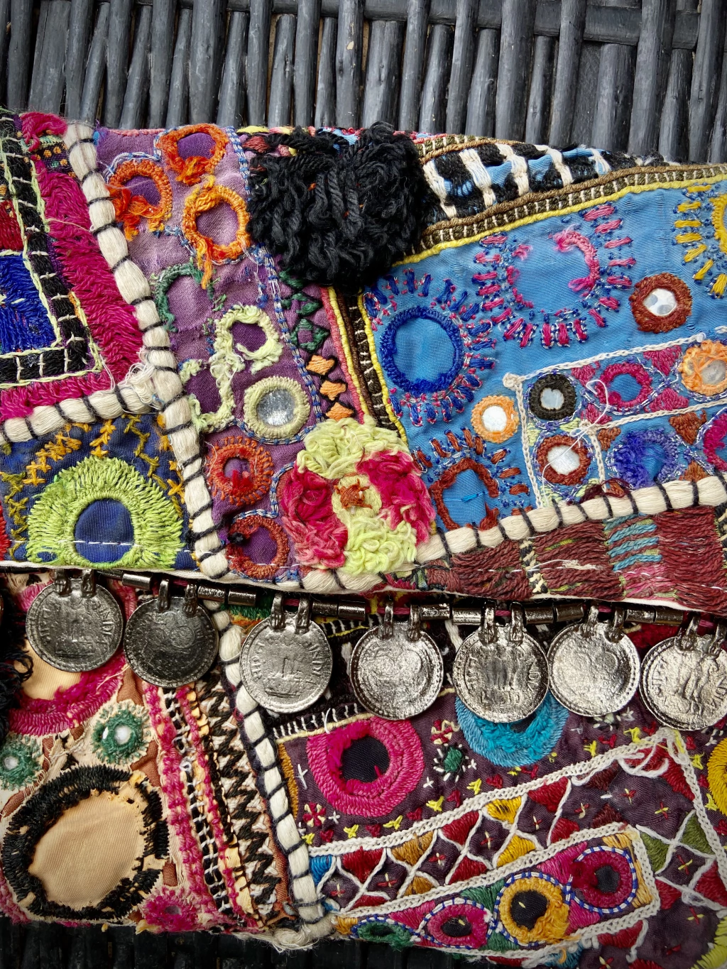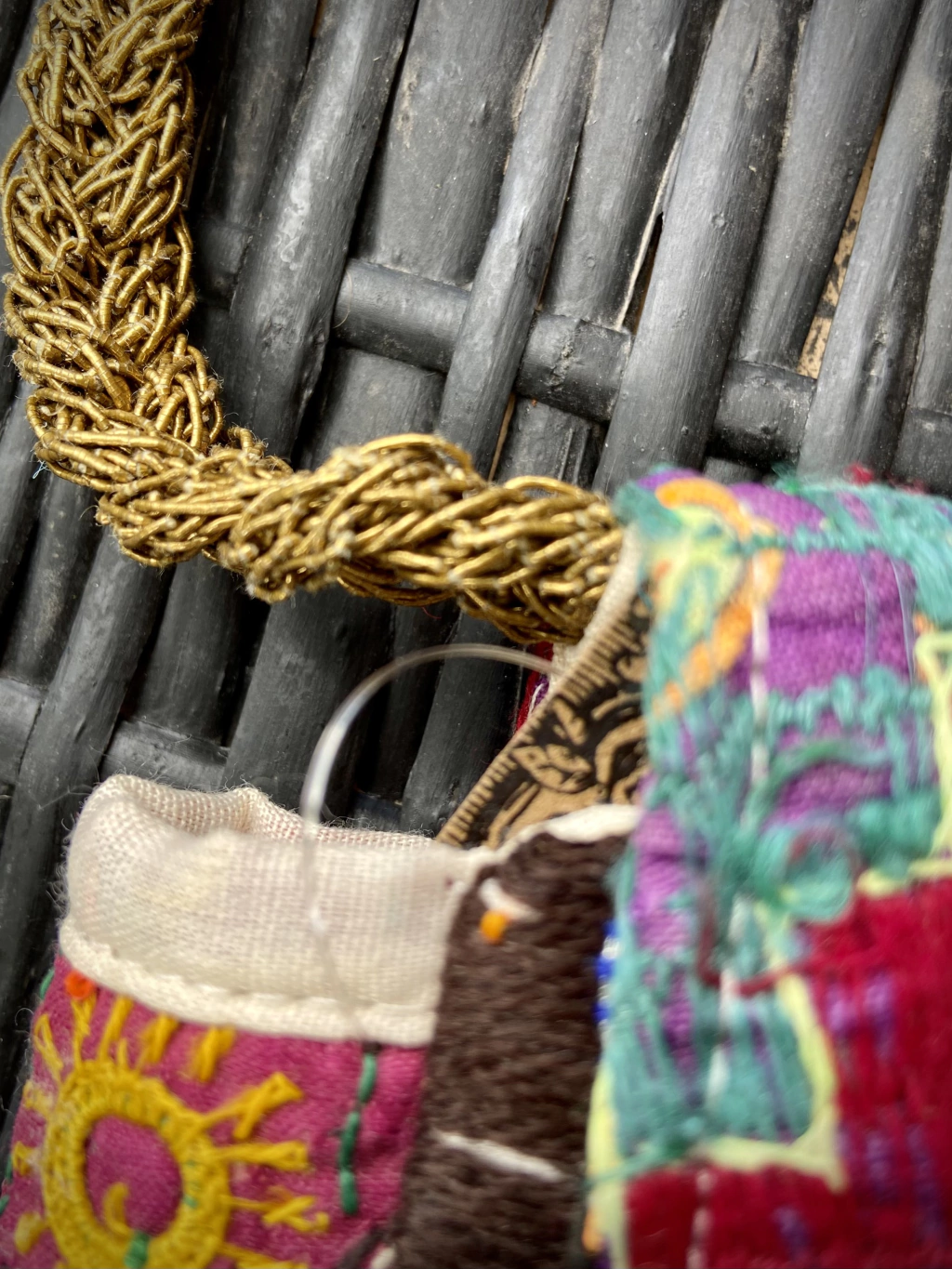 Cartera o sobre bordado, con solapa con cierre imantado y tira de pompones al costado. Detalle de monedas metálicas. Son piezas únicas, varían los tonos y bordados