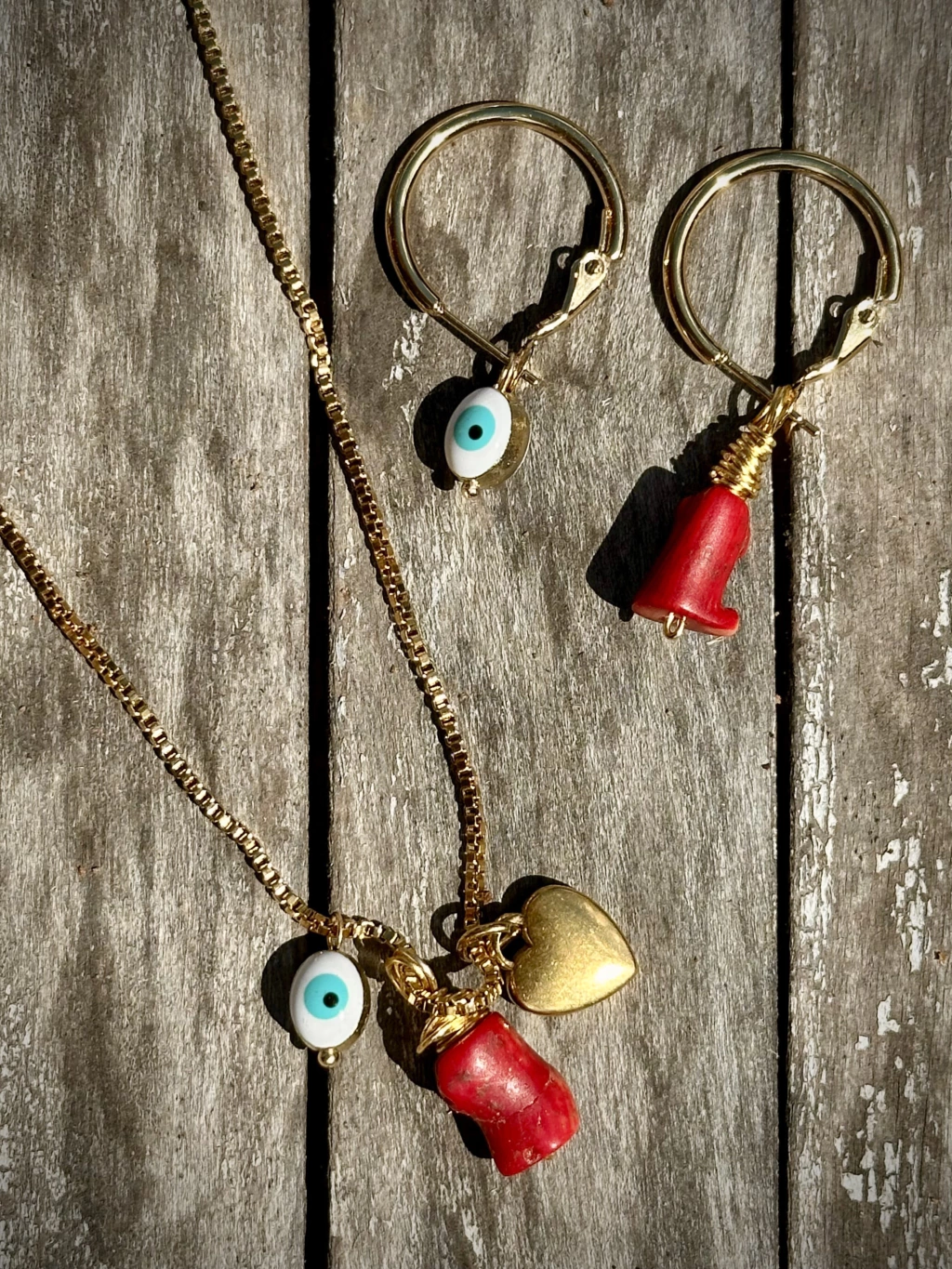 Cadena de acero dorada con 3 dijes (ojo, corazon dorado y pidra roja irregular)
