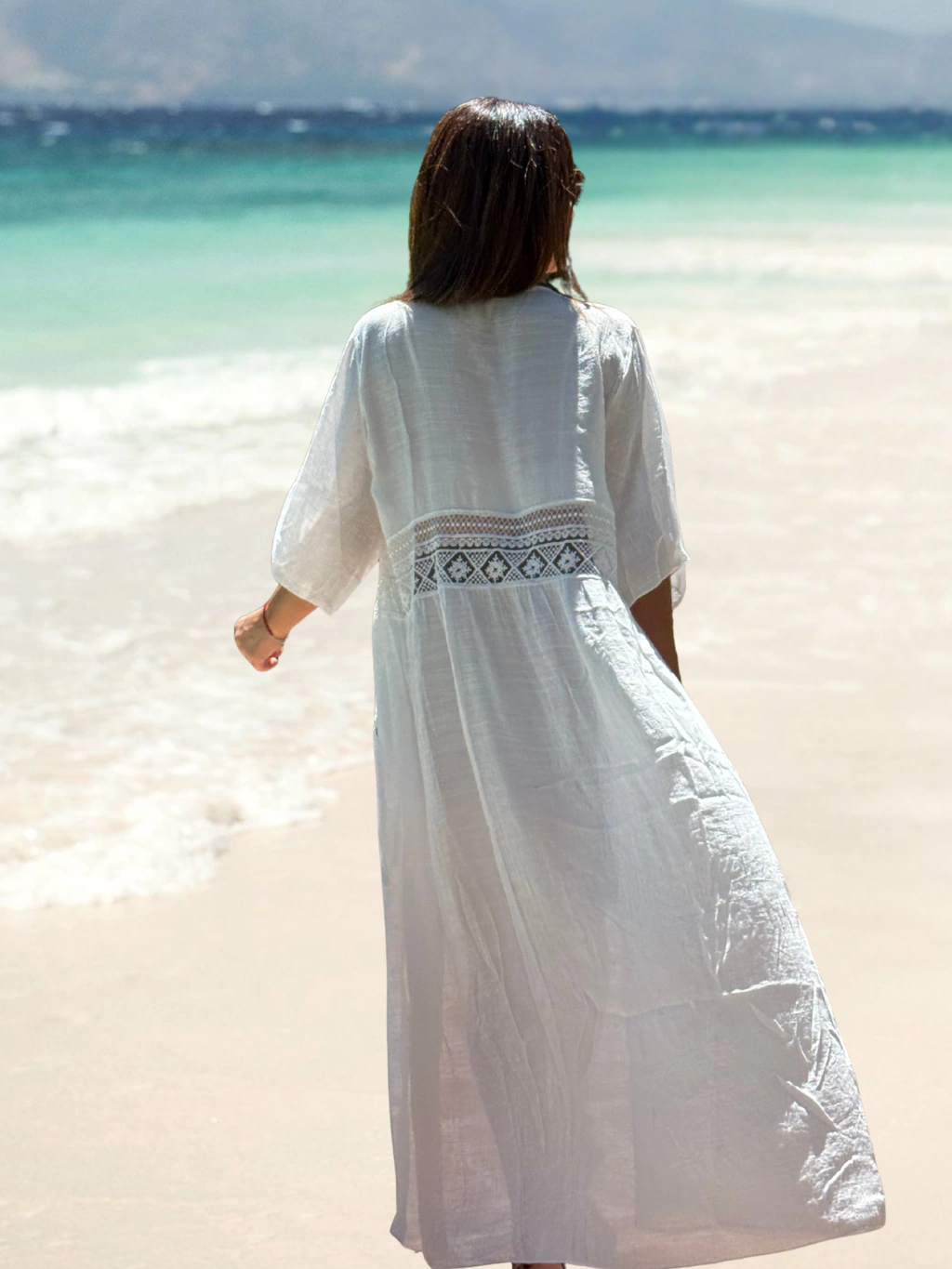 Composición 62 % viscosa, 38 % algodón, ideal para un look playero, fresco, boho