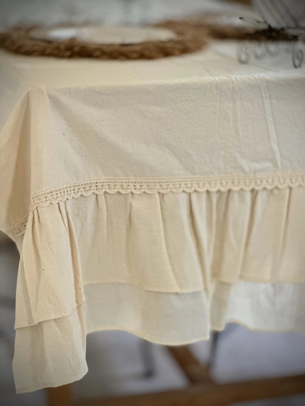 Descubrí la elegancia del mantel de tussor con volado y puntilla, en un encantador color natural. Con medidas de 2m60cm x 1m50cm, es el toque perfecto para embellecer tus encuentros especiales.