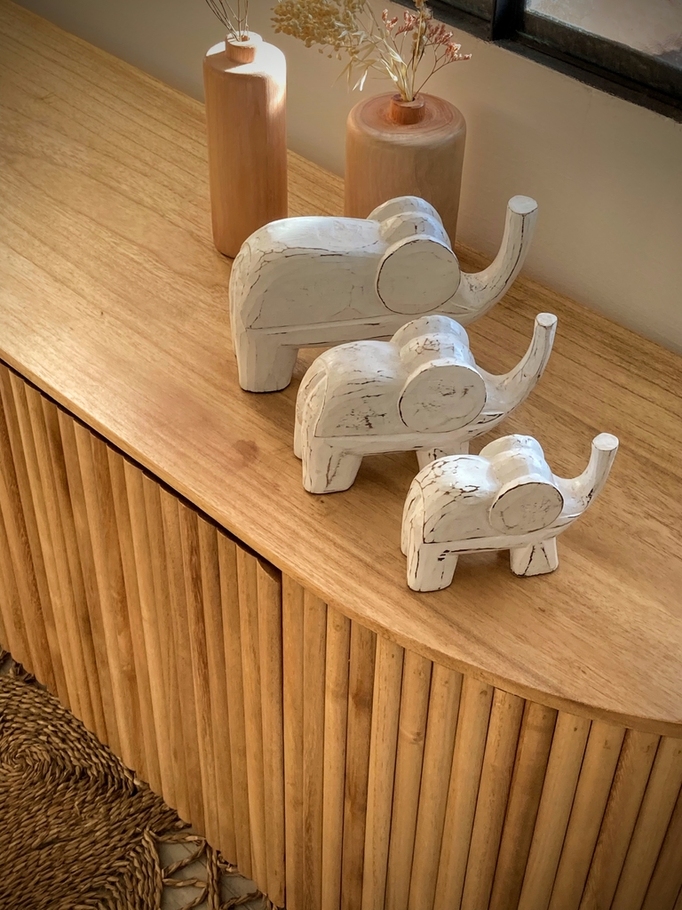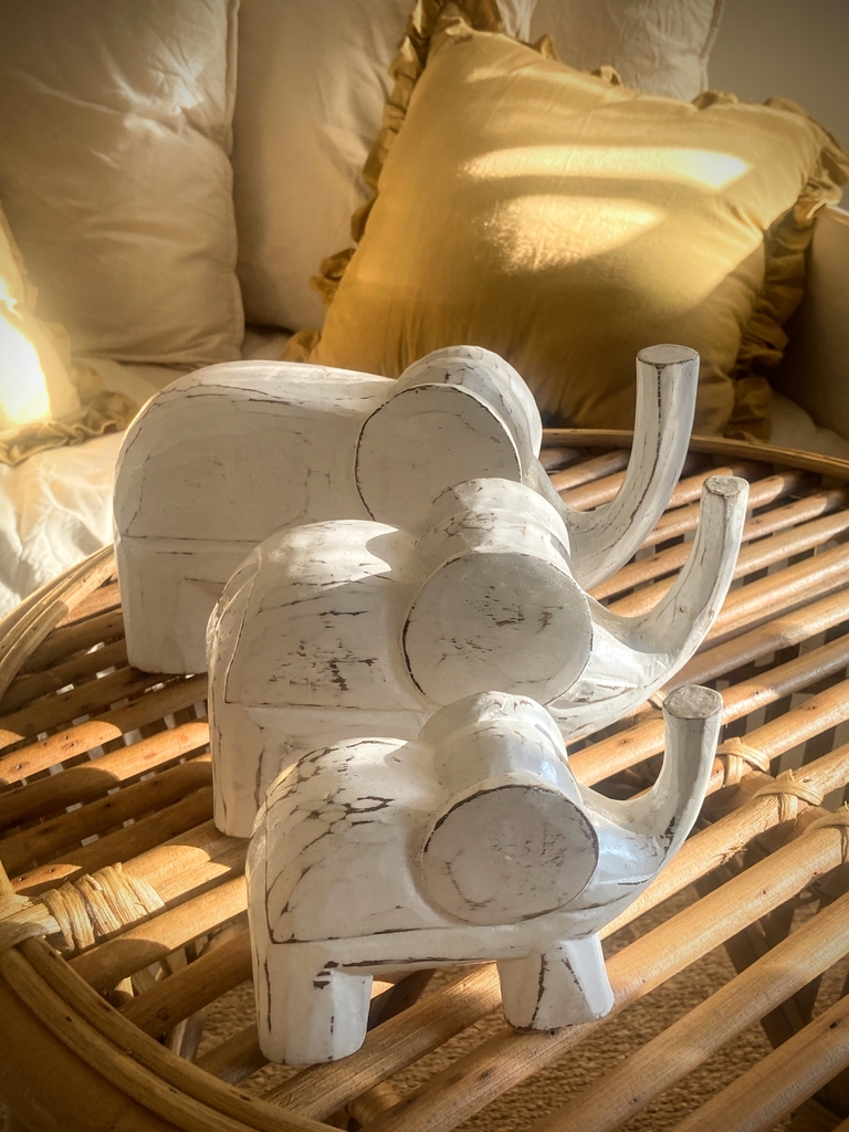 Set de 3 elefantes de madera tallada, procedentes de Indonesia. Incluye figuras de 10cm, 12cm y 15cm. Ideales para decorar cualquier ambiente, aportando un toque exótico y artesanal. Son símbolo de protección, buena suerte y unión familiar. Perfectos para regalar o realzar la energía positiva del hogar. ¡Transformá tu espacio con elegancia y significado!
