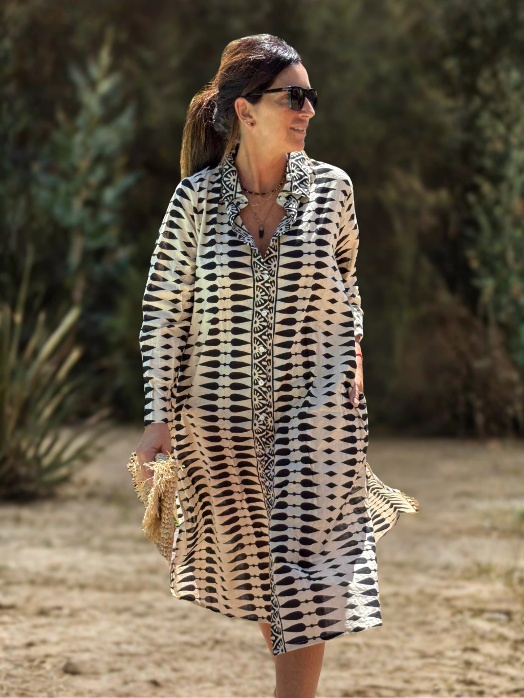 Descubrí la elegancia atemporal del vestido confeccionado con algodones de la India estampado con la técnica block print. Su cuello aporta distinción, mientras que los botones nacarados y las mangas realzan su diseño único y sofisticado. Cada pieza es exclusiva, fusionando tradición y tendencia en un look versátil. Ideal para destacar en cualquier ocasión. Isalo cerrado como vestido o abierto con short o jean abajo