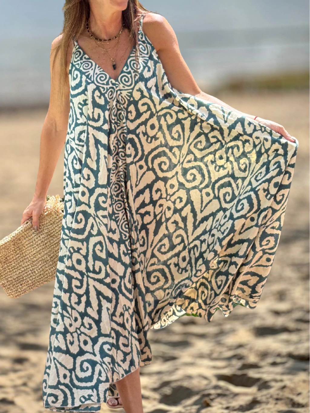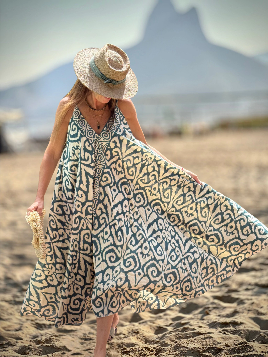 Descubrí la elegancia exótica con esta Solera confeccionada con Algodón de India, estampado en técnica block print. Su delicado estampado artesanal y caída fluida realzan tu figura, convirtiéndolo en la elección ideal para ocasiones especiales o un look sofisticado.